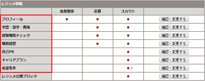 - [レジュメ公開ブロック]の[確認・変更する]ボタンをクリック