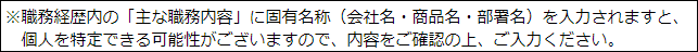 職務経歴の内容(会社名、商品名、プロジェクト名などの固有名称の使用)によっては、個人を特定できてしまう場合があります。